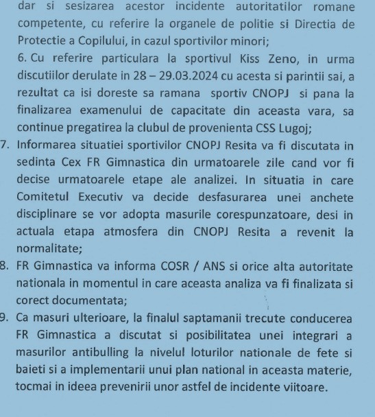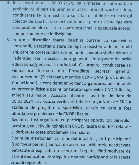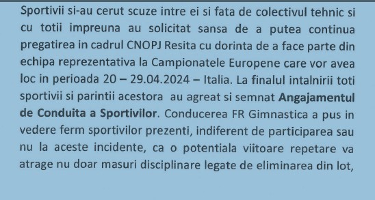 Într-o comunicare în care a venit cu precizări forului respectiv, cel care finanțează Centrul Național de Pregătire Olimpică de la Reșița, oficialii federației recunosc incidentele, spun că au făcut ședințe, toată lumea și-a cerut scuze și dau vina pe „carențe educaționale”.