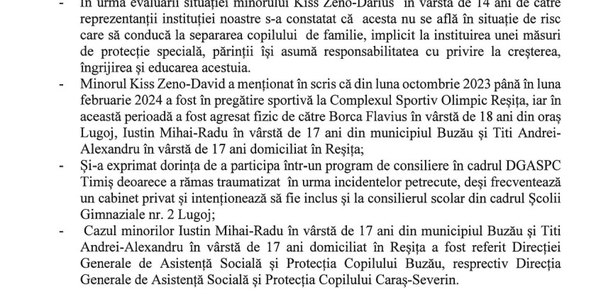 „Având în vedere că din conținutul articolului din ProSport rezultă faptul că acel copil are domiciliul în județul Timiș, Direcția Generală de Asistență Socială și Protecția Copilului Caraș-Severin va referi această situație Direcția Generală de Asistență Socială și Protecția Copilului Timiș în vederea luării măsurilor legale care se impun, în acest sens, conform legislației în vigoare”, anunțau la 48 de ore de la aparișia articolului de la Protecția Copilului din Reșița.