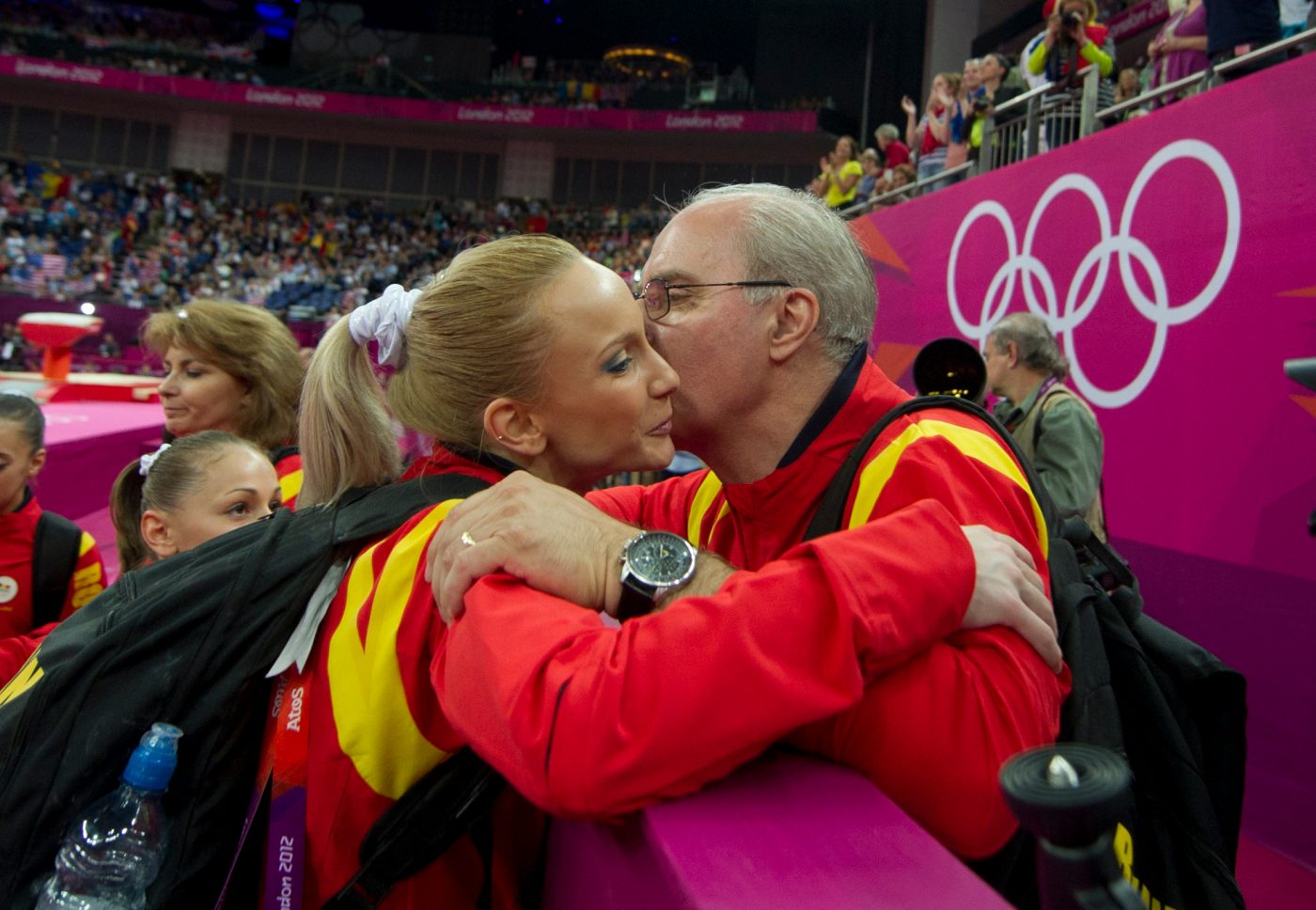 Sandra Izbasa se imbratiseaza cu antrenorul Octavian Bellu dupa castigarea medaliei de bronz de catre lotul feminin al Romaniei in finala pe echipe, la Jocurile Olimpice de la Londra, marti, 31 iulie 2012. BOGDAN MARAN / MEDIAFAX FOTO