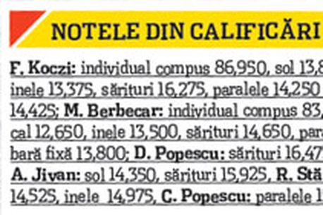 Elevii lui Nicușor Pascu au făcut primul pas spre îndeplinirea obiectivului care și l-au trasat la CE, prezența în cât mai mult finale, pentru a lupta pentru podium. Astfel, Flavius Koczi și Marius Berbecar s-au calificat în finala la individual compus (astăzi, ora 16:20/TVR2), Daniel Popescu (foto) la