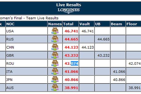UPDATE 15:39 Australiencele au încheiat evoluția la bârnă, Larisa se încălzește deja. China a obținut până acum cel mai mare total la bârnă: 44.066. La sărituri, aparatul la care lucrează Rusia, cel mai mare punctaj a fost obținut până acum de americance – 46.741