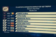Cătălina Ponor a încheiat cu două victorii participarea la Cupa Mondială de la Baku (Azerbaidjan). Calificată cu cele mai mari note în finalele de la bârnă și sol, tripla campioană olimpică și-a păstrat poziția de lider și după exercițiile din finală. Constănțeanca s-a impus la sol cu 13.433 (13.233 în calificări) și cu 13.833 la bârnă (14.233 în calificări). Fără a fi strălucite, notele sunt și rezultatul noului cod de punctaj, care a scăzut notele de plecare cu câteva zecimi. La feminin, România a mai fost reprezentată de Anamaria Ocolișan, care nu s-a calificat în nicio finală pe aparate. Cătălina Ponor și Anamaria Ocolișan se pregătesc pentru Campionatele Europene de la Cluj-Napoca (19-23 aprilie). Nici la masculin gimnaștii români nu s-au calificat în vreo finală.