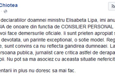 „Ca urmare a declaratiilor doamnei ministru Elisabeta Lipa, imi anunt public DEMISIA de onoare din functia de CONSILIER PERSONAL al dansei. Luni voi face demersurile oficiale. Ii sunt prieten apropiat si stiu ca e o mama devotata, un parinte exceptional, o sotie model. Regret cuvintele sale, sunt convins ca nu reflecta gandirea dumneaei. La randul meu, sunt persoana publica, jurnalist care critica astfel de derapaje si tata a trei copii. Nu pot sa ma asociez cu aceasta situatie nefericita.