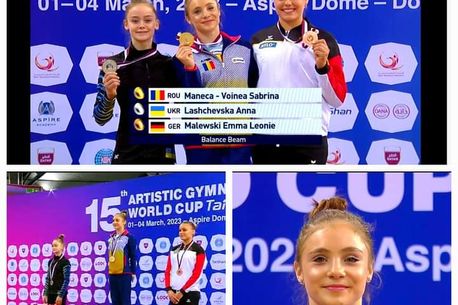 Sabrina Voinea – Maneca a obținut aurul la bârnă, la Cupa Mondială din Qatar după ce a fost notată cu 13.766 (dificultate – 6, execuție 7.776), și a luat medalia de aur. Sportiva din România a fost urmată de Anna Lashchevska din Ucraina, care a luat argintul cu nota 13.333, iar pe locul trei s-a aflat Emma Leonie Malewski din Germania, nota 13.233.