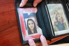 Adriana Iordache ține în portofel o fotografie recentă a Larisei, o felicitare-mărțișor primită de la Larisa, de pe vremea în care acesta era încă elevă în școala generală. Foto: Cezara Paraschiv