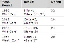 victorii și 14 eșecuri, se pregăteau deja de sărbătorirea calificării în runda divizională a play-off-ului. Doar că situația s-a schimbat incredibil spre finalul partidei! A fost nevoie de al doilea cel mai mare comeback din istoria play-off-ului NFL pentru ca Indianapolis Colts să întoarcă meciul și să scoată o victorie uriașă în fața celor de la Chiefs, scor 45-44! A fost meciul quarterbackului Andrew Luck, care a încheiat partida cu 443 de yarzi, 4 TD-uri și 3 intercepții. Și o recuperare a unui fumble, în cinci yarzi, care s-a transformat într-un touchdown superb marcat cu un rush play plin de încredere. A fost un comeback remarcabil al celor de la Colts, care conform calculelor ESPN, mai aveau la pauză doar 3,1% șanse de victorie. Doar că gazdele au reușit al doilea cel mai mare comeback din istoria play-off-ului NFL, după cel reușit de Buffalo Bills în 1992, contra lui Houston Oilers, când au șters un deficit de 32 de puncte pentru a câștiga în prelungiri cu 41-38!