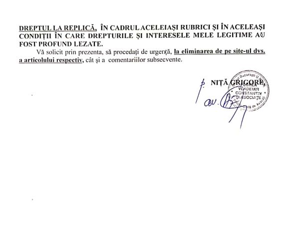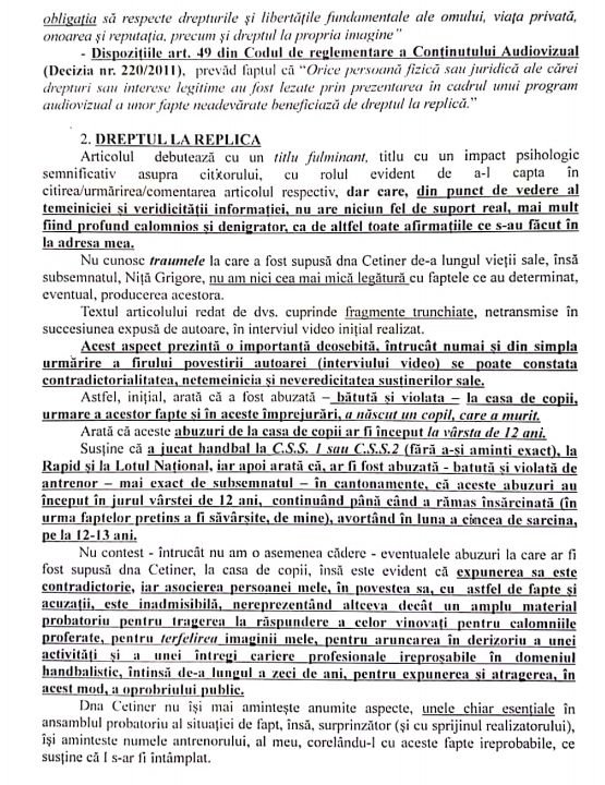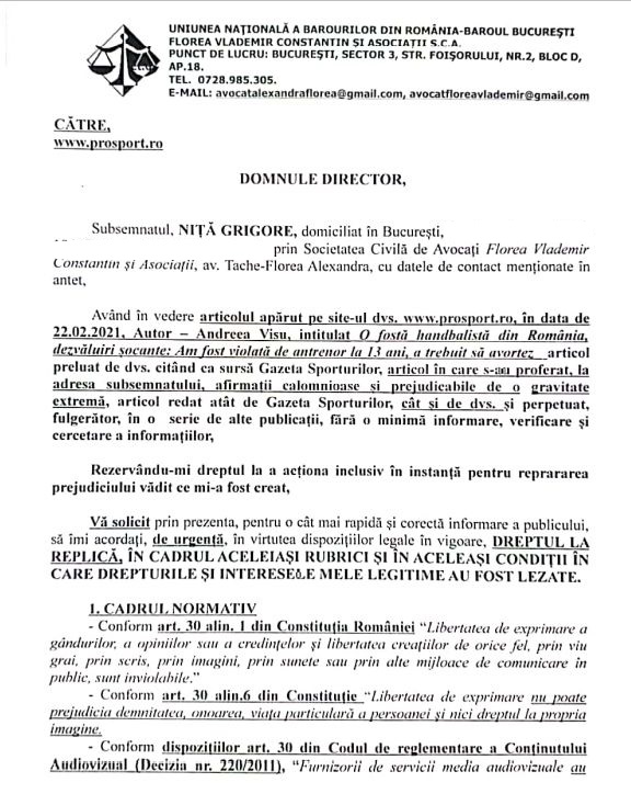 După publicarea articolului «O fostă handbalistă din România, dezvăluiri șocante: „Am fost violată de antrenor la 13 ani, a trebuit să avortez”», articol preluat din Gazeta Sporturilor, am primit la redacție poziția domnului Niță Grigore prin care ne solicită acordarea dreptului la replică, replică ce se regăsește mai jos.