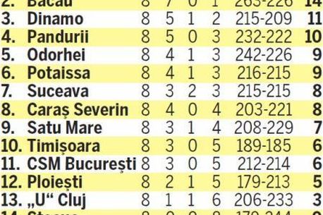 Rezultate Liga Națională, masculin, etapa a 8-a: Caraș Severin – Satu Mare 31-23, CSM București – „U” Cluj 30-22, Suceava – Bacău 19-28, Steaua – CSM Ploiești 24-31, Dinamo – Timișoara 21-19, Turda – Pandurii 26-25, Odorhei – HCM Constanța 32-34.