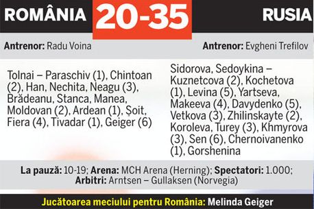 Partida de ieri, cu Rusia, a trecut oarecum în plan secund, Radu Voina hotărând să-și menajeze perla, pe Cristina Neagu, dar și pivoții Oana Manea și Ionela Stanca. În prima echipă și-au făcut simțită prezența Florina Chintoan, pentru prima dată în acest turneu final, și Adina Fiera, iar ceva mai târziu Ada Nechita, Ada Moldovan, Oana Șoit și Roxana Han. Rezultatul final? Unul halucinant, dacă n-am fi avut contextul calificării în semifinale.