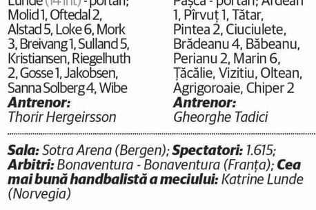 Dacă la Oradea, România s-a bătut de la egal la egal cu Norvegia cu ajutorul unei defesive bine așezate și a unui efort generos, acum tricolorele au jucat cu garda jos. Cel puțin după minutul 19, moment în care s-a consemnat ultima egalitate a jocului: 7-7. Heidi Loke, anihilată perfect în România, a avut bilet de voie la Bergen, astfel că s-a dezlănțuit. Pivotul de la Györ a apărut la finalizare în 11 situații, față de patru în România, reușind să marcheze de șase ori, dar să și scoată trei aruncări de la șapte metri. Norvegia n-a avut-o însă numai pe Loke, ci și nenumărate contraatacuri, care au tocat naționala lui Tadici.