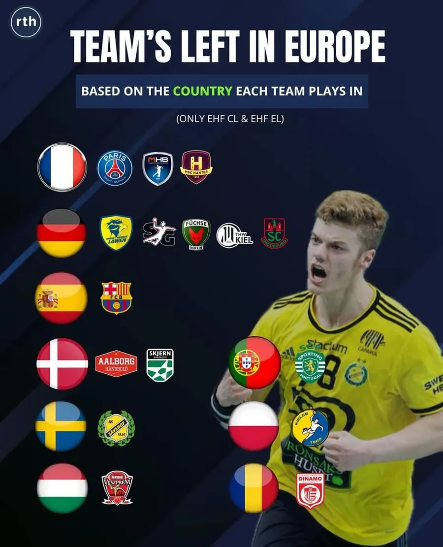 Celelalte țări cu echipe rămase în Liga Campionilor și European League: Spania (Barcelona), Suedia (Savehof), Ungaria (Veszprem), Portugalia (Sporting), Polonia (Kielce), România (Dinamo).