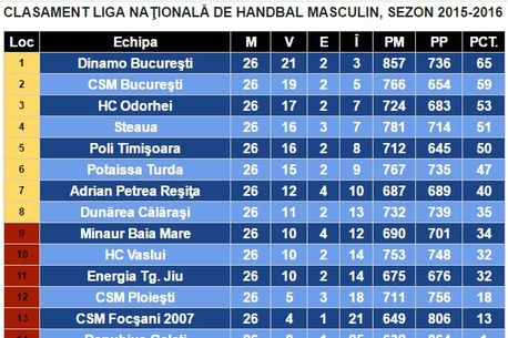 Clasament Liga Națională de handbal masculin, sezonul 2015-2016. Aici găsești clasamentul actualizat al campionatului de handbal din România. Rezultate handbal România