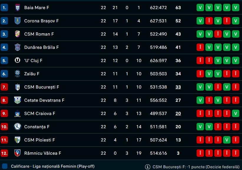 ProSport a consultat arhiva și informația este adevărată cu un singur detaliu: CSM București a terminat în acum 9 ani pe locul 7 pentru că a fost penalizată cu un punct după ce a achitat cu întârziere amenda stabilită de FR de Handbal pentru cartonașul roșu primit de Irina Glibko în etapa a 12-a.