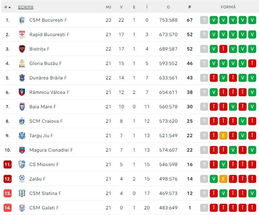 Fără eșec în campionat și cu un singur egal, CSM București a ajuns la 67 de puncte și nu mai poate fi ajunsă de rivala Rapid, aflată la egalitate cu Bistrița (52 de puncte).