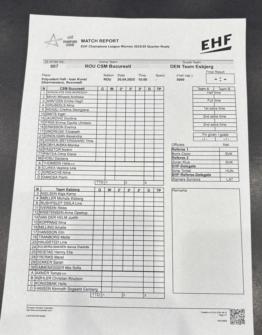 Returul dintre CSM București și Esbjerg se va juca peste o săptămână, pe 27 aprilie, de la ora 17:00.