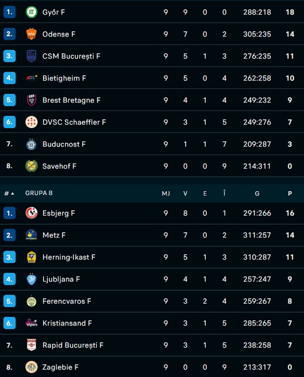 După opt etape, campioana României este deocamdată pe locul 3, cu 11 puncte. Alte rezultate de duminică: Gyor – IK Savehof 39-20, Brest Bretagne Handball – DVSC Debrecen 38-28, SG BBM Bietigheim – Odense 25-28.
