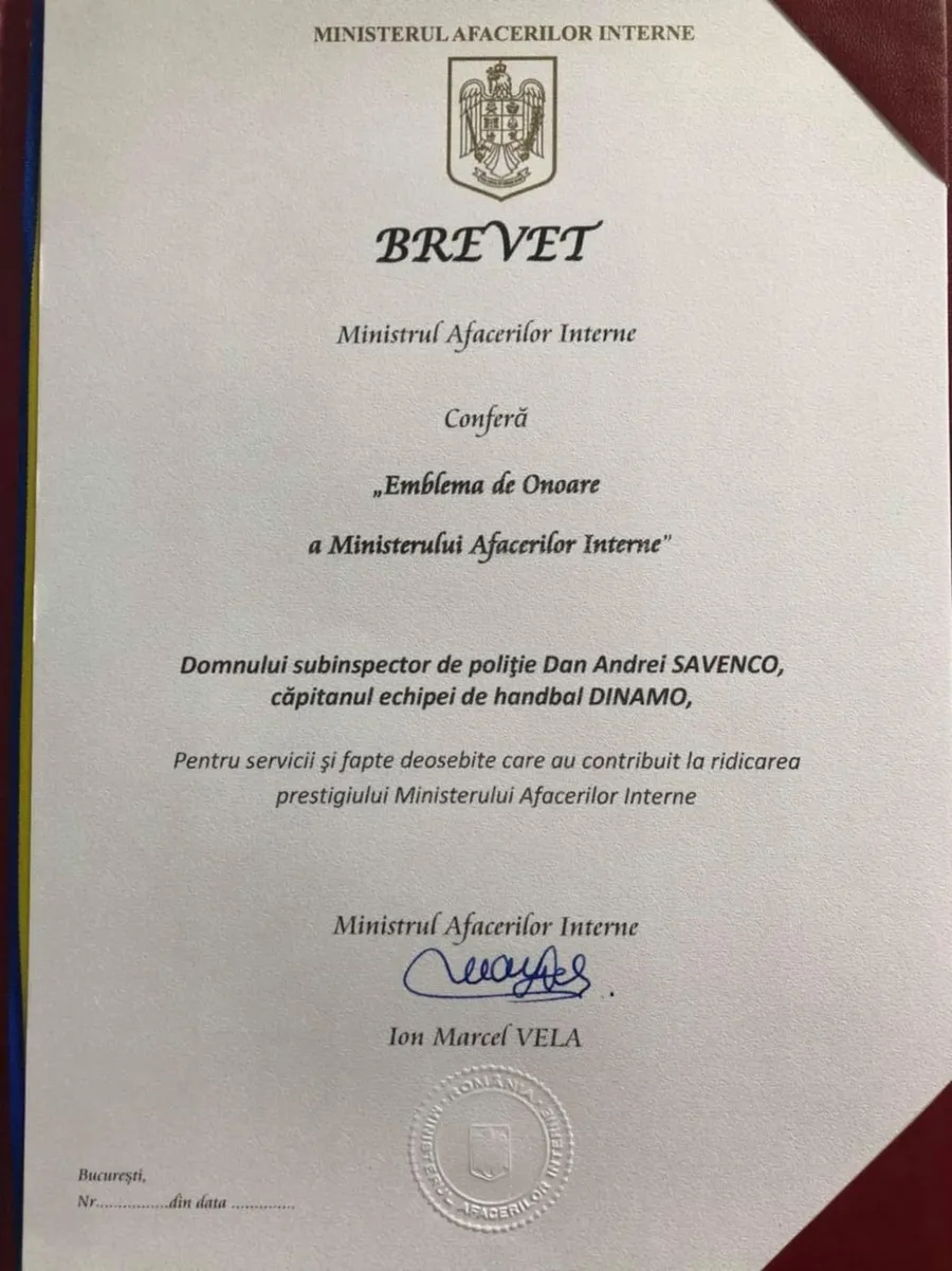 Dan Savenco, căpitanul echipei de handbal Dinamo București, a fost felicitat azi, personal, de către Marcel Velea, ministrul Administrației și Internelor, pentru activitatea depusă în timpul stării de urgență. El a primit brevetul „Emblema de Onoare”.
