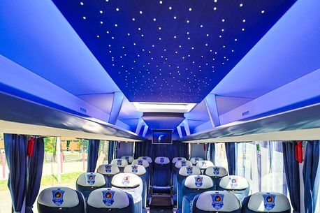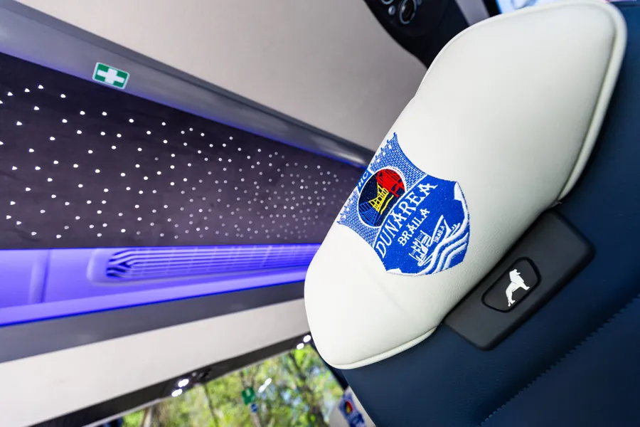 Design-ul personalizat al autocarului reflectă cu fidelitate identitatea clubului datorită culorilor emblematice și a siglei echipei brodată pe fiecare tetieră.