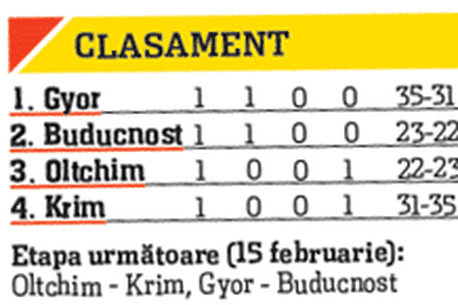 În schimb, Vâlcea a păcătuit în atac, ratând foarte mult, fapt evidențiat, printre altele, și de procentajul foarte slab al liniei de nouă metri, reușite 25%. Mai mult, spre final acțiunile Oltchimului au fost construite precipitat, iar greșelile tehnice s-au înmulțit. Buducnost a stăpânit mai bine ultimele minute și s-a impus cu 23-22.