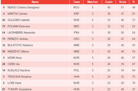 16:15 Cristina Neagu e lider în clasamentul golgheterelor Europeanului, cu 40 de goluri în 5 meciuri, două peste Carmen Martin și șapte peste Isabelle Gullden. Cu o calificare la Budapesta, Neagu ar avea șanse mari să câștige al doilea titlu de golgheteră la un European, după cel din 2010, când a înscris 53 de goluri.