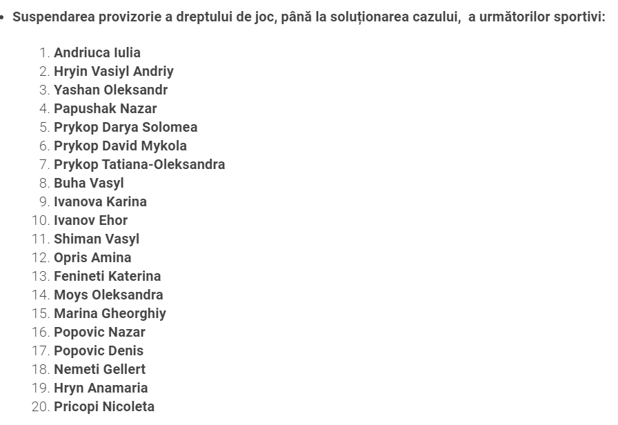 În primă fază s-a decis suspendarea dreptului de joc a sportivelor Anna Ivanenko (Minaur Baia Mare), Adryana Naumenko (Unirea Slobozia), Oleksandra Znolobovy și Irina Zinatulina (ambele de la CSM Tg. Jiu).