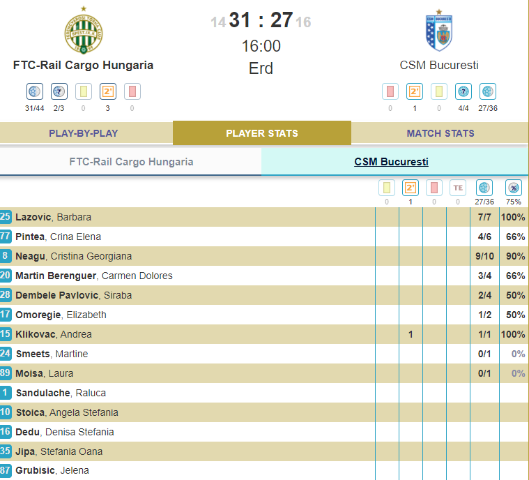 Scor final: Ferencvaros – CSM București 31-27.