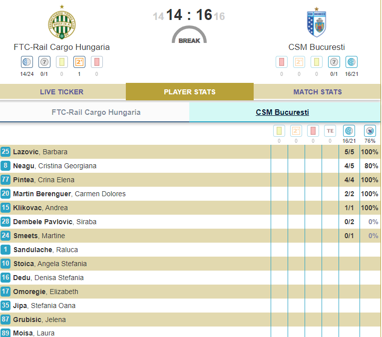 CSM București suferă în zonă centrală, absențele jucătoarelor Gabriela Perianu și Dragana Cvijic se simt. Ferencvaros a înscris deja câteva goluri bune de aici și are 11-8