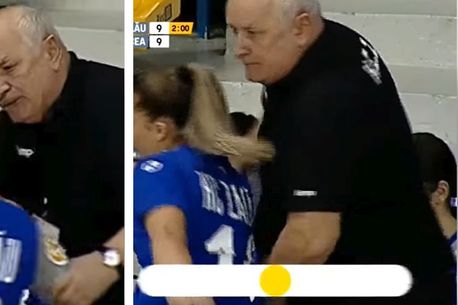 Jucătoarea a fost împinsă de antrenor după ce a văzut o eliminare de două minute, așa cum se poate vedea din imaginile distribuite pe Facebook de contul „Handbal Feminin”.