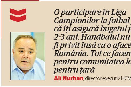 În raport cu fotbalul, handbalul se află încă departe de a fi o afacere rentabilă, nu numai în România, ci chiar la nivel global. Sunt puține cluburi în lume care ar putea spune azi că fac și profit, poate doar în Germania să existe câteva cazuri fericite. Totul pleacă de sus. Spre exemplu, în fotbal, primele patru echipe din Europa în sezonul 2013-2014, Bayern, Dormund, Real Madrid și FC Barcelona, au câștigat numai de la UEFA cel puțin 45 de milioane de euro fiecare, reprezentând market-pool-ul (n.r. – bani proveniți din drepturi TV) și performanța sportivă. În schimb, la handbal, EHF-ul răsplătește cluburile care ajung în vârf cu sume care abia dacă le acoperă 10-15% din bugete. În „Final 4”, faza în care ajung cele mai bune patru echipe din Champions League, fondul de premiere este de un milion de euro. Cu tot ce a câștigat și în faza grupelor, echipa care obține trofeul dacă ajunge la 600.000-700.000 de euro premii din partea EHF.