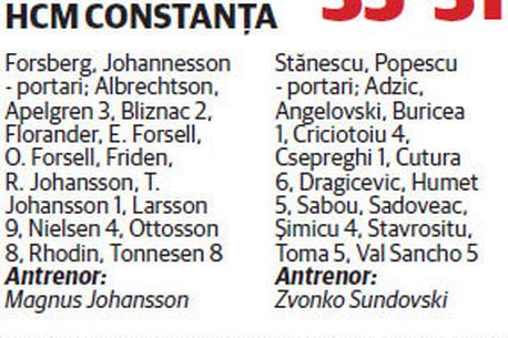 Ajunsă în situația de alerga după egalare, Constanța s-a precipitat în multe momente și nu a mai reușit să reducă niciodată diferența la mai mult de două goluri. Jocul în valuri le-a permis suedezilor să se distanțeze chiar și la cinci goluri în repriza secundă (30-25, min. 48), suficient pentru a avea un final fără emoții: 35-31. Așadar, HCM-ul a pierdut un tempo important pentru calificarea în optimi, în condițiile în care a avut totușți cel mai accesibil adversar din grupă, însă are toate șansele de a se reabilita, săptămâna viitoare, cu Veszprem.