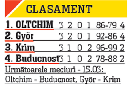 Lansată spre semifinalele Ligii Campionilor, Oltchim și-a propus să mai facă astăzi, la Ljubljana, un pas spre careul de ași al competiției. Indiferent însă de rezultatul final, Vâlcea rămâne la mâna ei în lupta pentru calificare. „Este un meci foarte important, dar nu decisiv. Pentru noi, ziua în care se poate decide calificarea este 15 martie, când jucăm acasă cu Buducnost. Întotdeauna e bine să punem și răul înainte, dar fetele sunt hotărâte să-și vândă scump pielea la Ljubljana și să obțină o victorie care ne-ar asigura în proporție de 90% calificarea", ne-a declarat Ioan Gavrilescu, președinte CS Oltchim. „Locul întâi în grupa principală" Vâlcenii iau în calcul orice rezultat în fața lui Krim. „Dacă din diferite considerente, cum ar fi o evoluție mai proastă a noastră, un joc de senzație al gazdelor sau o intervenție brutală a arbitrilor, s-ar consemna o înfrângere, nu dramatizăm nimic. Șansele de calificare rămân în continuare în mâinile noastre, indiferent de ce fac ceilalți", a punctat șeful grupării vâlcene. De menționat că tot azi se joacă și Buducnost - Gyor. Înainte de a pleca spre Ljubljana, Ioan Gavrilescu a vorbit și despre șansa Oltchimului în acest sezon de Liga Campionilor: „Dacă nici acum nu suntem în stare să mergem în semifinale, atunci nu știu dacă în viitor ne mai putem propune lucruri îndrăznețe. Echipa noastră are totuși valoare, iar obiectivul nu este deloc fantezist. Cu lotul pe care îl avem la dispoziție, în mod cinstit vă spun că suntem între