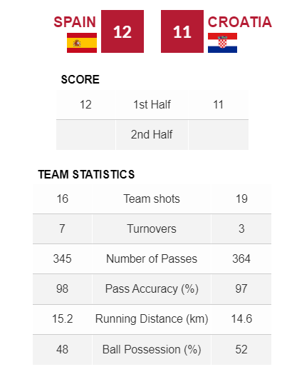 Oamenii Spaniei veniți de pe bancă au întors meciul în favoarea echipei lor. Perez de Vargas a apărat șase mingi din opt aruncări în ultimele 11 minute, iar interii Magueda și Canellas au înscris patru goluri după ce Croația a atins diferența maximă în meci, 10-7. Înlocuirile lui Duvnjak și Karacic nu au avut același efect în tabăra Croației.