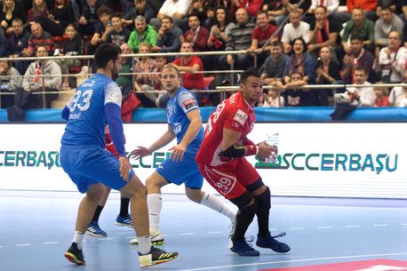 Amine Bannour de la Dinamo Bucuresti (echipament rosu) joaca impotriva vicecampioanei Poloniei la handbal masculin, Wisla Plock, pentru calificarea in optimile de finala ale Ligii Campionilor, miercuri 30 octombrie 2019, in Bucuresti.GEORGE FLUSTER / MEDIAFAX FOTO
