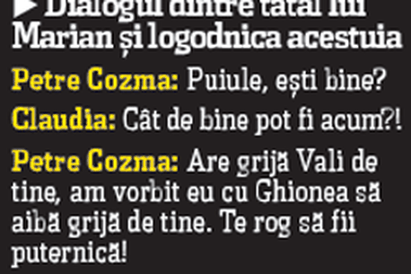 „Am vorbit pe internet aseară cu el, pe la 11:00 și ceva. Venise de la meci și era fericit că bătuseră. Mi-a zis că pleacă în oraș, că îi cinstește un coleg pentru că i-a născut soția”, începe doamna Cozma o reconstituire dureroasă. „De dimineață am primit un telefon: «A murit Marian! A fost înjunghiat de trei ori în inimă!!!». Atunci am murit și eu, vă spun sincer”, spune sfârșit nea Petre, lacrimile năvălindu-i pe chip. „Ne pregăteam de nuntă, iar acum plec să-mi aduc băiatul în țară ca să-l îngrop. Doamne, ce nenorocire!”, mai adaugă tatăl lui Marian.