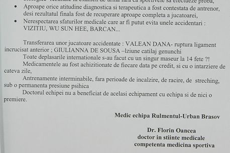 După meciurile cu Larvik și Oltchim, doctorul echipei, Florin Oancea, a declanșat un atac virulent la adresa staffului, susținând că vina accidentărilor suferite de Woo Sun Hee, Patricia Vizitiu, absente pe final de sezon, dar și a altor handbaliste care au jucat însă cu dureri, îi aparține în totalitate Marianei Târcă, datorită suprasolicitării la care le-a supus pe jucătoare. El a acuzat antrenamentele interminabile desfășurate sub o permanentă presiune psihică, susținând, totodată: „Antrenorul s-a crezut un mic Dumnezeu atotcunoscător”. În susținerea medicului au venit, vineri, jucătoarele, care i s-au plâns patronului Teodor Florescu de tratamentul la care au fost supuse în acest sezon. Mai mult, conform unor surse, mai mulÂte handbaliste au condiționat preÂÂzența la Brașov și în sezonul următor de plecarea familiei Târcă.