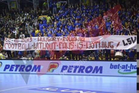 Fanii prezenți în sala din Vâlcea la partida Oltchim – Ferencvaros (22-partida 23), din Liga Campionilor, au pregătit un banner special pentru a protesta la decizia FIFA de a interzice accesul fanilor la Ungaria – România, din preliminariile CM 2014.