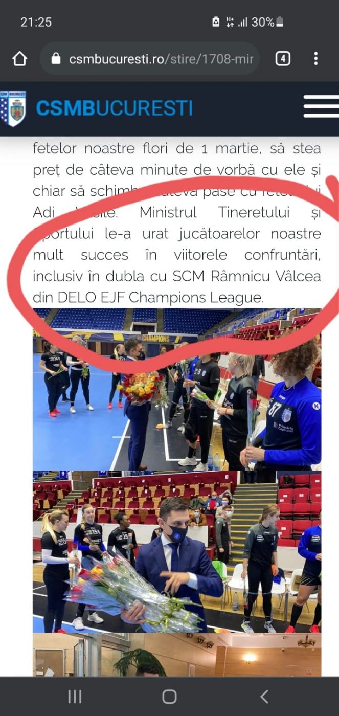 Ministrul Carol Eduard Novak a ajuns ieri la antrenamentul echipei CSM București și le-a oferit flori jucătoarelor de 1 martie. După această vizită, clubul bucureștean a făcut o postare pe pagina oficială de Facebook, care a inflamat spiritele înaintea „dublei” cu SCM Rm. Vâlcea din Liga Campionilor: