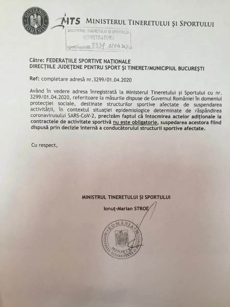 „Având în vedere adresa înregistrată la Ministerul Tineretului și Sportului cu nr. 3299/01.04.2020, referitoare la măsurile dispuse de Guvernul României în domeniul protecției sociale, destinate structurilor sportive afectate de suspendarea activității, în contextul situației epidimiologice determinate de răspândirea coronavirusului SARS-CoV-2, precizăm faptul că întocmirea actelor adiționale la contractele de activitate sportivă nu este obligatorie, suspendarea acestora fiind dispusă prin decizie internă a conducătorului structurii sportive aferente”, este informarea făcută de MTS către federații și DJTS-uri.