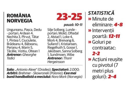 Cele două naționale s-au întâlnit aseară, la Oradea, la debutul preliminariilor Campionatului European din 2014. Partida nu a avut caracter decisiv, în condițiile în care accederea la turneul final se face în urma a patru meciuri, iar României i-ar fi suficiente și două victorii cu Belarus, o echipă dintr-o altă categorie, mai accesibilă. Astfel, disputa a căpătat o altă conotație, un fel de „evaluare națională”, în condițiile în care adevăratele examene sunt în decembrie, în Serbia. Subiectele n-au fost deloc ușoare, gradul de dificultate fiind sporit prin prezența în tabăra oaspeților a unor handbaliste precum Heidi Loke și Katrine Lunde, jucătoare care au contribuit din plin și la „uciderea” Oltchimului în sezonul trecut de Champions League. Cele două nordice de la Györ aveau să fie și decisive în finalul partidei: Lunde a avut o intervenție salutară într-un duel unu la unu cu Gabriela Perianu, în minutul 58, la scorul de 23-22, iar la atacul imediat următor Norvegia s-a desprins la două goluri printr-o „înșurabare” a pivotului Loke, marcă înregistrată.
