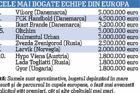 Aproximativ 6 milioane de euro sunt banii pe care Oltchim și Rulmentul Urban îi pun la bătaie împreună în acest sezon pentru a obține titlul în Liga Națională, dar și pentru un parcurs cât mai lung în Liga Campionilor, de ce nu, chiar până în ultimul act al competiției. Râmnicu Vâlcea și Brașovul, adversare duminică (ora 11:00, în direct pe Sport.ro), sunt cele mai bogate formații din întreg handbalul românesc (feminin și masculin), bugetele adunate ale celorlalte 12 combatante din Liga Națională feminină fiind mai mici decât cele 6 milioane ale „granzilor“. Cele două combatante au pătruns și într-un Top 10 la nivel european, salariile oferite de Oltchim și Rulmentul putând rivaliza cu cele oferite de Viborg, FCK Handbold, Ikast, Zvezda sau Gyor. Ambele grupări au bugete de salarii ce depășesc 1 milion de euro, media fiind pe undeva în jurul a 70.000-80.000 de euro. Cele mai bune jucătoare din ambele tabere câștigă peste 120.000 de euro.