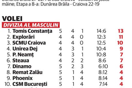 Campioana României la handbal feminin – Oltchim și Știința Bacău – volei feminin continuă să înșiruie victorii în acest sezon. Cele două formații sunt sigurele care au adunat maximum de puncte din cele cinci întreceri interne care și-au programat etape de campionat la sfârșitul săptămânii trecute.