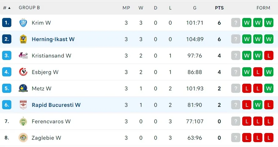 Rapid a acumulat doar două puncte, după ce în primele două dispute din grupa B a pierdut cu Team Esbjerg (28-30) şi a învins Zaglebie Lubin (26-25), cu mari emoții.
