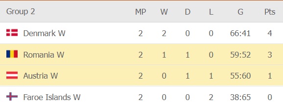 Insulele Feroe nu contează această grupă, așa că lupta pentru primele două locuri care duc la turneul final se va da între Danemarca, România și Austria.