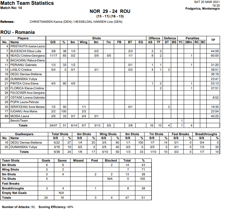 11-13. Stine Oftedal a făcut slalom în apărarea tricoloră, a scos 2 minute eliminare la Cristina Florica și 7 metri, transformat de Stine Skogrand.