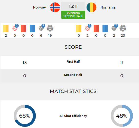 Norvegia conduce la pauză cu 13-11. Tricolorele nu au jucat rău, dar au întâmpinat probleme în zona centrală a apărării. Nordicele au obținut 7 aruncări de la 7 metri și au fructificat 6 dintre ele. Și în atac, eficiența este în prezent la sub 50%.