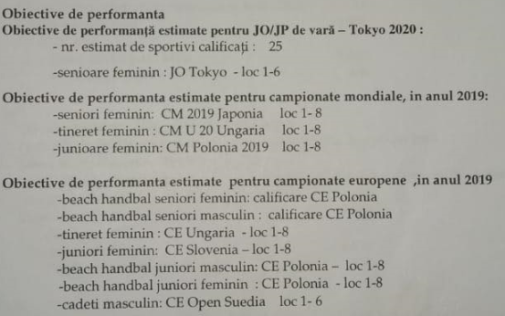 Conform Cererii de finanțare a Federației Române de Handbal din 21 ianuarie 2019, forul condus de Alexandru Dedu a prevăzut încă de atunci obiective de performanță pentru loturile de Beach Handball.