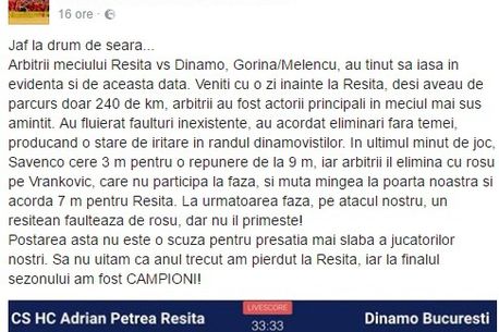 Imediat după partida de la Reșița, clubul Dinamo a postat pe pagina oficială de Facebook un mesaj dur la adresa arbitrajului, prezentând și modul cum au decurs ostilităâile în ultimele secunde ale jocului: