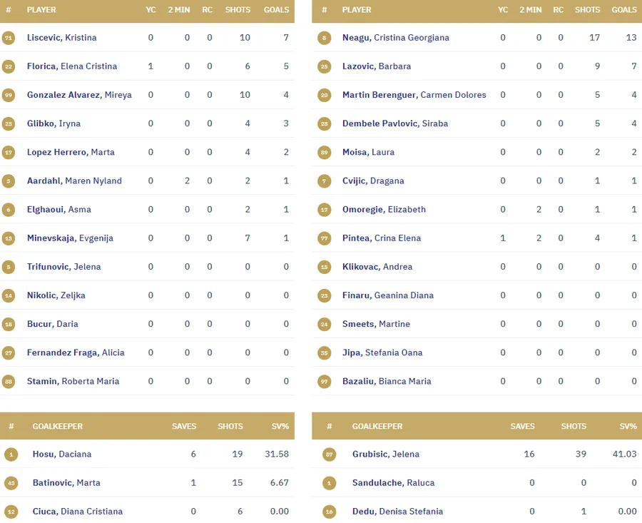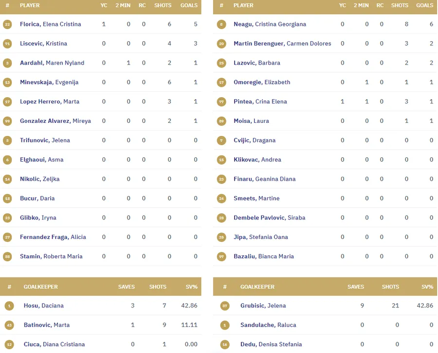 Barbara Lazovic a deschis scorul. La câteva secunde distanță, Elizabeth Omoregie a fost eliminată 2 minute. Egalează Cristina Florica.