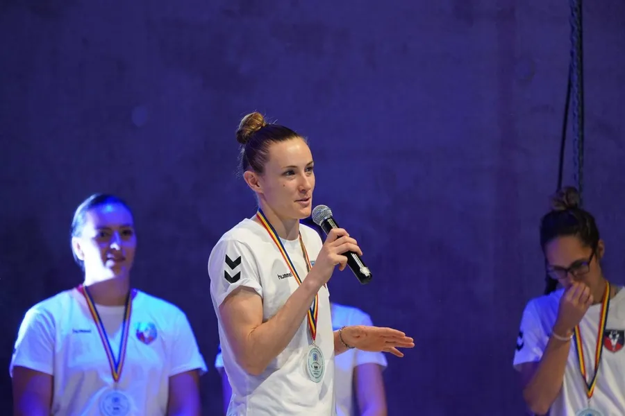 Jucătoarele, staff-ul și conducerea de la SCM au fost prezentate pe scenă și aplaudate minute în șir după câștigarea celor două trofee. „DJ” au fost căpitanul Marta Batinovic și antrenorul Florin Pera. Pe un ecran amplasat în spatele scenei au rulat clipuri și poze realizate în timpul finalei cu CSM și de la premierea din Polivalenta din Capitală.