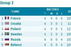 Toate cele trei meciuri de ieri din această grupă s-au încheiat la scor, în condițiile în care și Croația s-a distrat în fața Rusiei, scor 33-25. După această rundă, Franța s-a calificat în semifinale de pe prima poziție, chiar dacă ar pierde azi cu Suedia (n.r. are victorii directe și cu Croația, și cu Polonia în caz de egalitate de puncte), în timp ce Croația și Polonia vor juca de la ora 21:15 pentru al doilea loc în „careul de ași”.